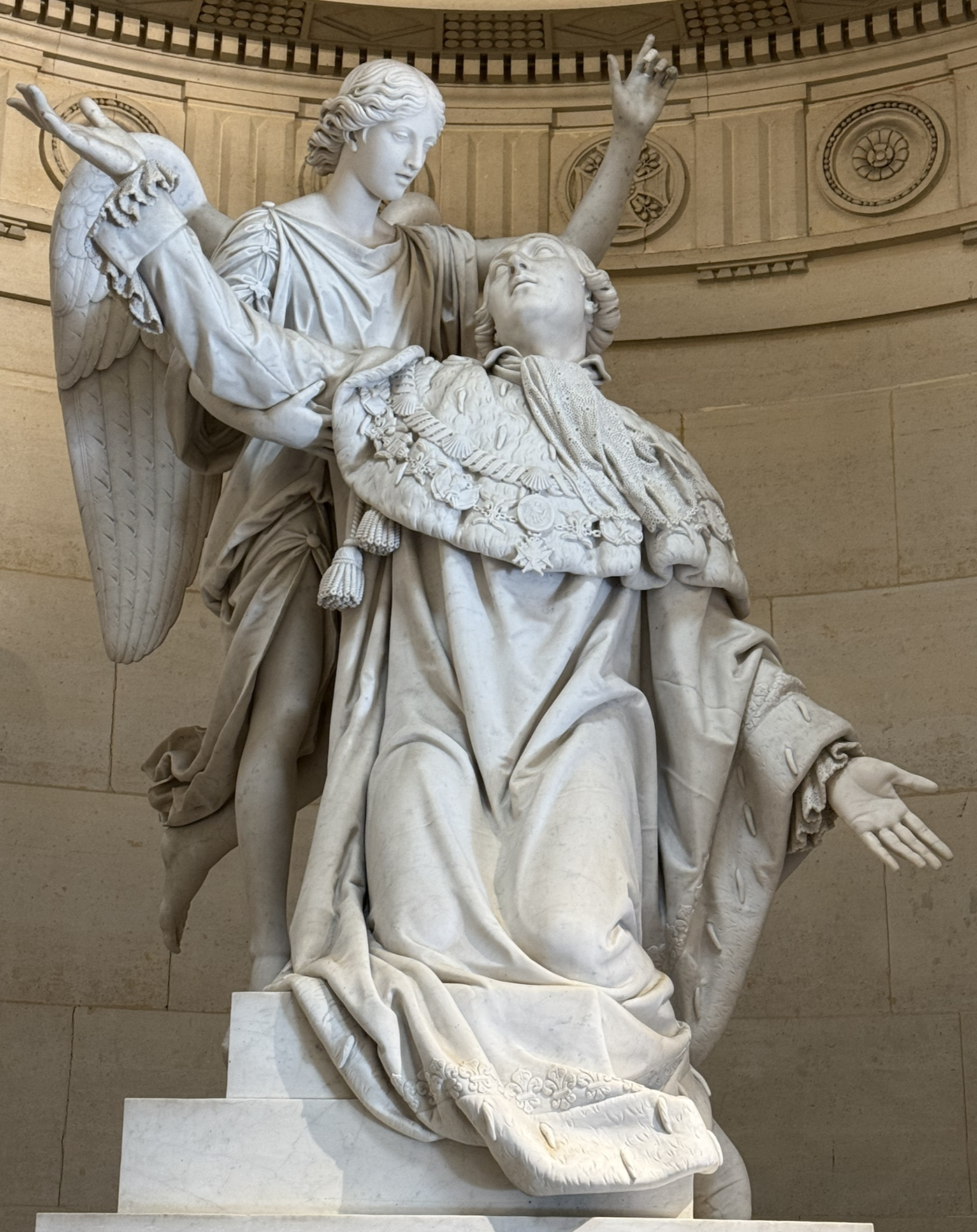 Just opposite the statue of Marie Antoinette in the Greek cross chapel is the statue by Francois-Joseph Bosio, Apotheosis of Louis XVI. Louis is dressed in his coronation robe with fleur de lys, as the angel points his way to heaven, and his last will and testament is engraved on the marble pedestal.