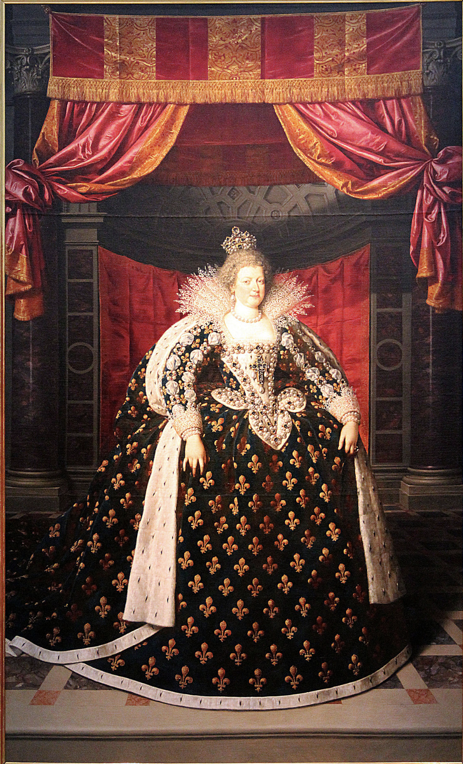 Painted around 1610 by the Flemish artist Pourbus, who had also painted the king and queen before. The queen, in her coronation robe and crown, fits the description of how queens were depicted in the Galerie des Rois. The painting's width is what casts doubt, as it is too large to fit between the room's pillars, but we may never know. You can see the painting in room 803 of the Richelieu wing, around the corner from the amazing Medici Cycle by Rubens. In the same room, a small version of a portrait of Henri IV is also on view, which isn’t associated with the Galerie des Rois, but he is adorable.