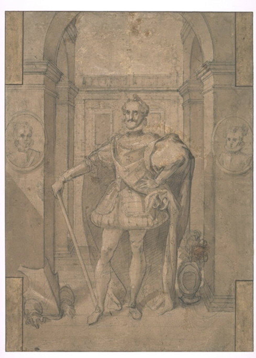 Commissioned on May 22, 1607, Bunel and his wife, Marguerite Bahuche, traveled around France, visiting chateaux and churches to find images of former rulers and their courts to use as the basis for painting the figures' likenesses. A sketch attributed to Bunel can be found in the Louvre archives, depicting Henri IV standing full-length in the center beneath an arch. On either side of the king are oval portraits: the dauphin Louis XIII on his right and his daughter Elisabeth on his left.