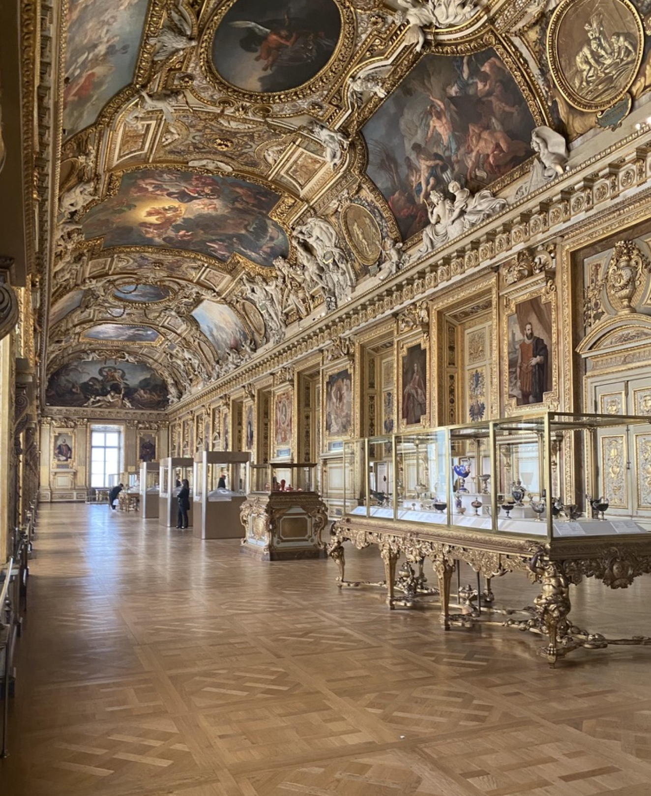 The construction of the Petite Gallery was finished in two years, and as early as May 1663, the sculptors of the many stucco elements of the ceiling were brought in to bring the ceiling to life, all from the vision of painter Charles Le Brun. Three years later, the sculpture work was complete, and Le Brun began painting, but it would all come to a screeching halt in 1671 when Louis XIV left Paris and the Palais du Louvre behind for Versailles.