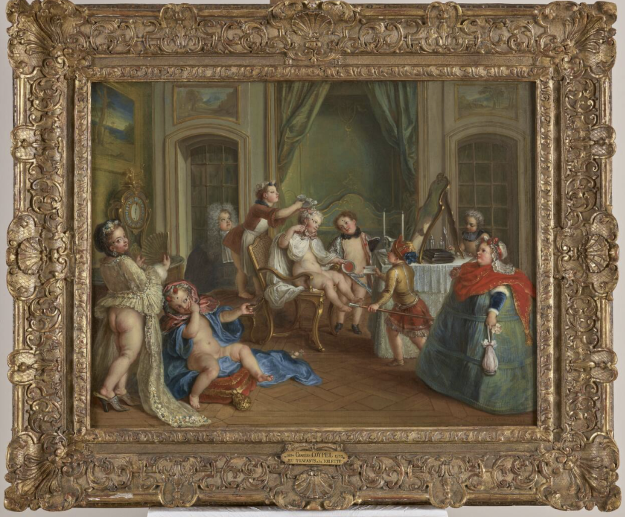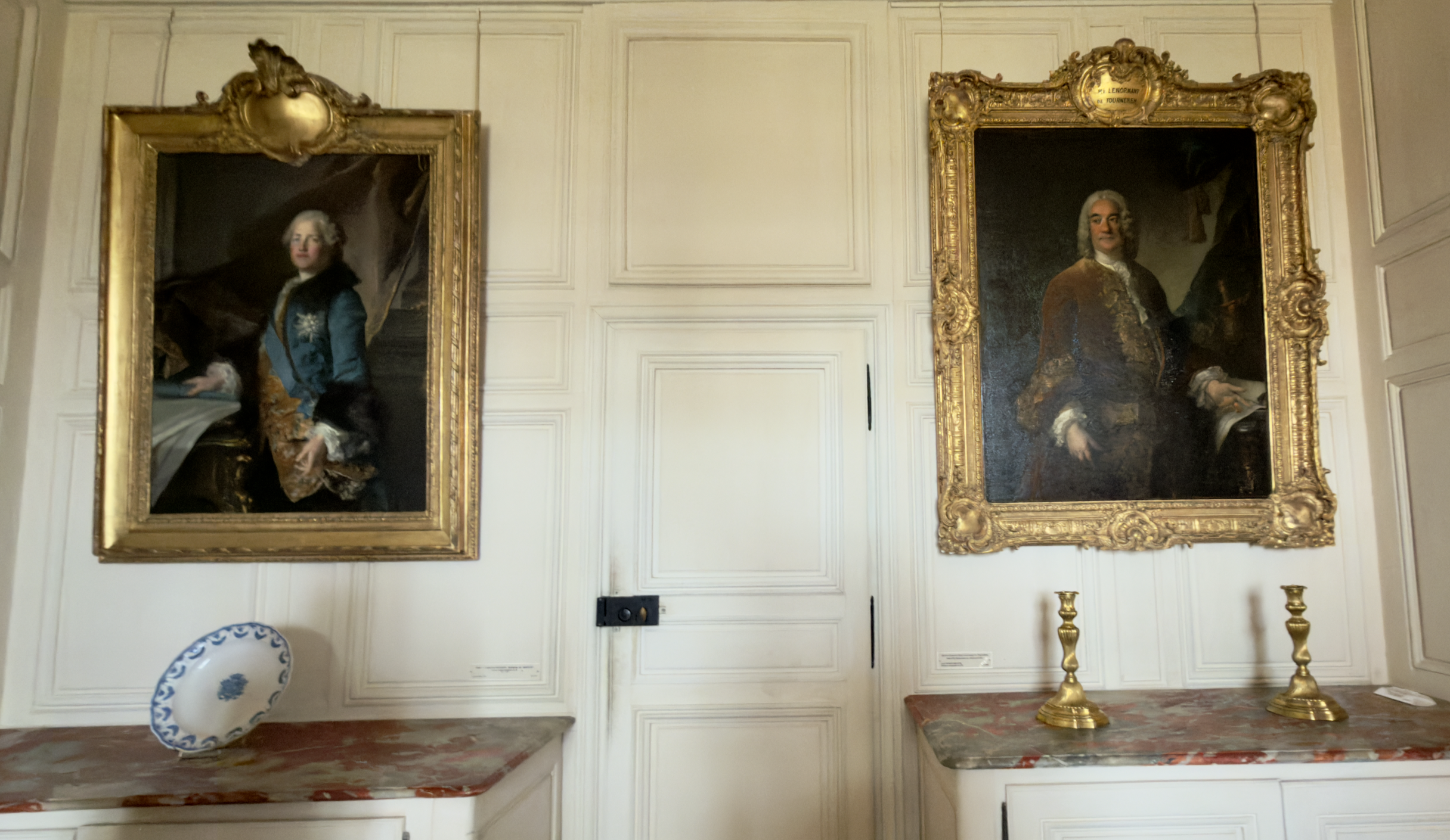 On either side of the doors are two of the important men of her life. On the right, a painting by Louis Tourqué and Charles-François Paul Le Normant de Tournehem, who, thanks to Pompadour's relationship, served as the superintendent of the king's buildings from 1746 to 1751. On the left side, also by Tourqué, Abel Francois Poisson, the Marquis of Marigny, and brother also served as superintendent following the death of Tournehem.