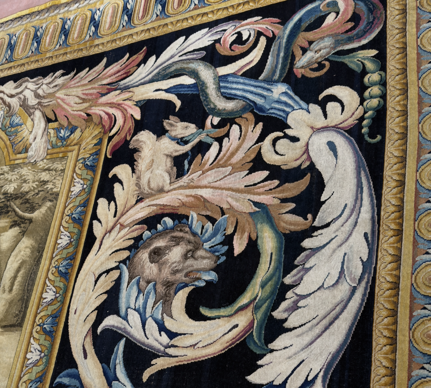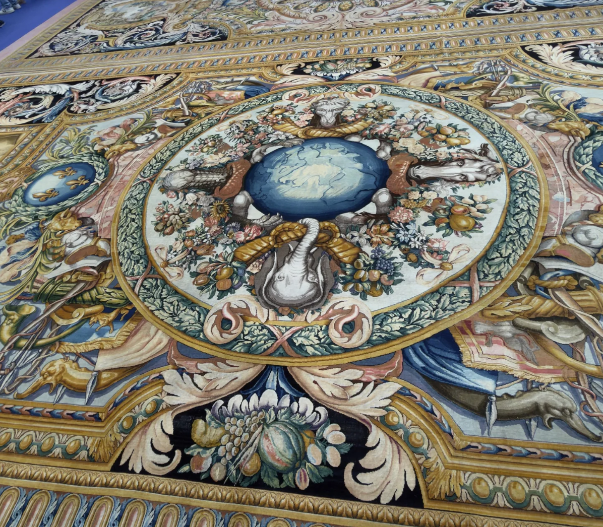 Carpet number 46, Earth is my favorite with the four corners of the world. In the center, a globe is surrounded by animals that represent the four parts of the world. A horse for Europe, a camel for Asia, a crocodile for the Americas, and an elephant for Africa. On either end, Ceres, the goddess of agriculture, on one side, and Bacchus, the god of wine, on the other. However, this one holds a hidden treasure that none of the others do.