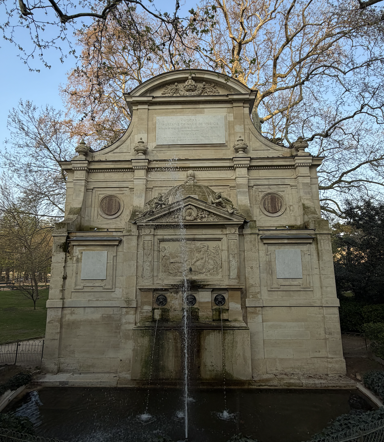 At the very top, the crown of Marie de Medici is over a plaque marking the two major stages of the fountain in its 1620 creation and 1863 renaissance, and the artists who brought it to life.