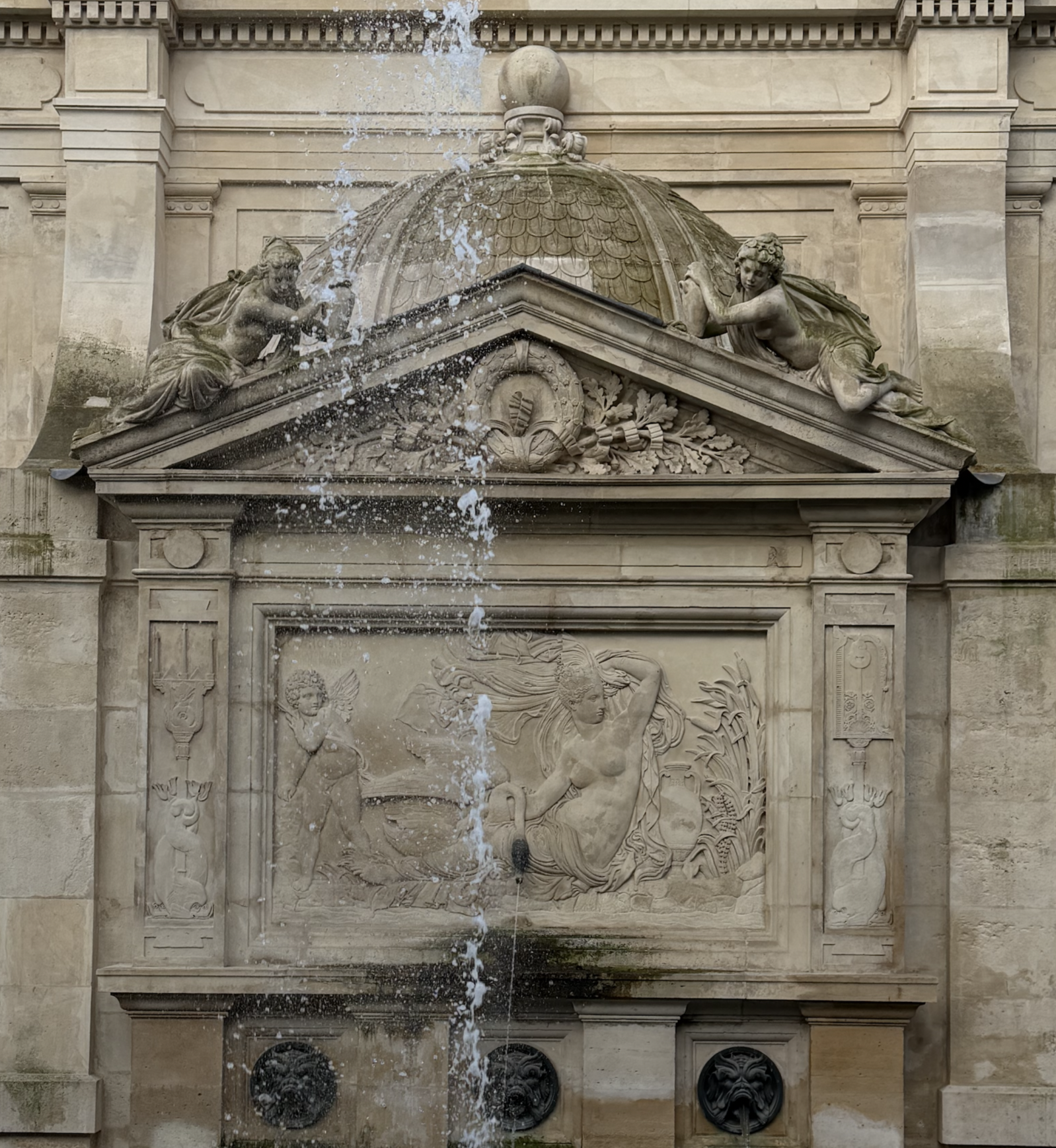 Much smaller than the Medici fountain, it sits on the back side that was mostly hidden from view until two years ago. Executed by Alphonse de Gisors with the help of sculptor Jean Baptiste Klagmann. The bas relief of Léda is bordered on either side with a triton and dolphins on the left and an oar with dolphins on the right.