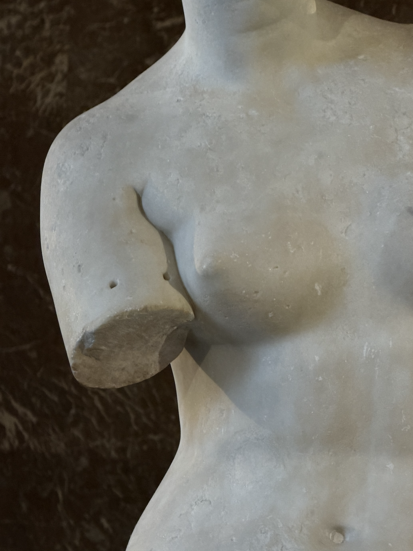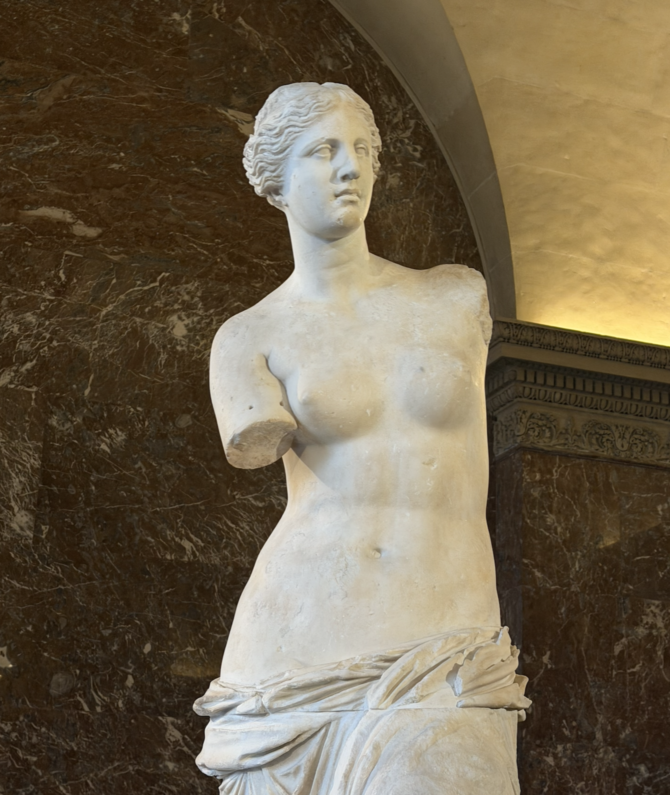 Venus was carved from two large blocks of Paros marble, a nearby island known for its translucent quality and one of the finest marbles in Greece. Her lower body was covered with draped fabric, and her upper body and head. The sculptors of the time conserved every inch of marble, which might give us some clues about her arms. Her right arm was sculpted and placed close to her body. As for her left arm, which is missing today, it would have been a separate piece attached to her shoulder with a mortise-and-tenon joint, creating a perfect fit without any glue or cement.