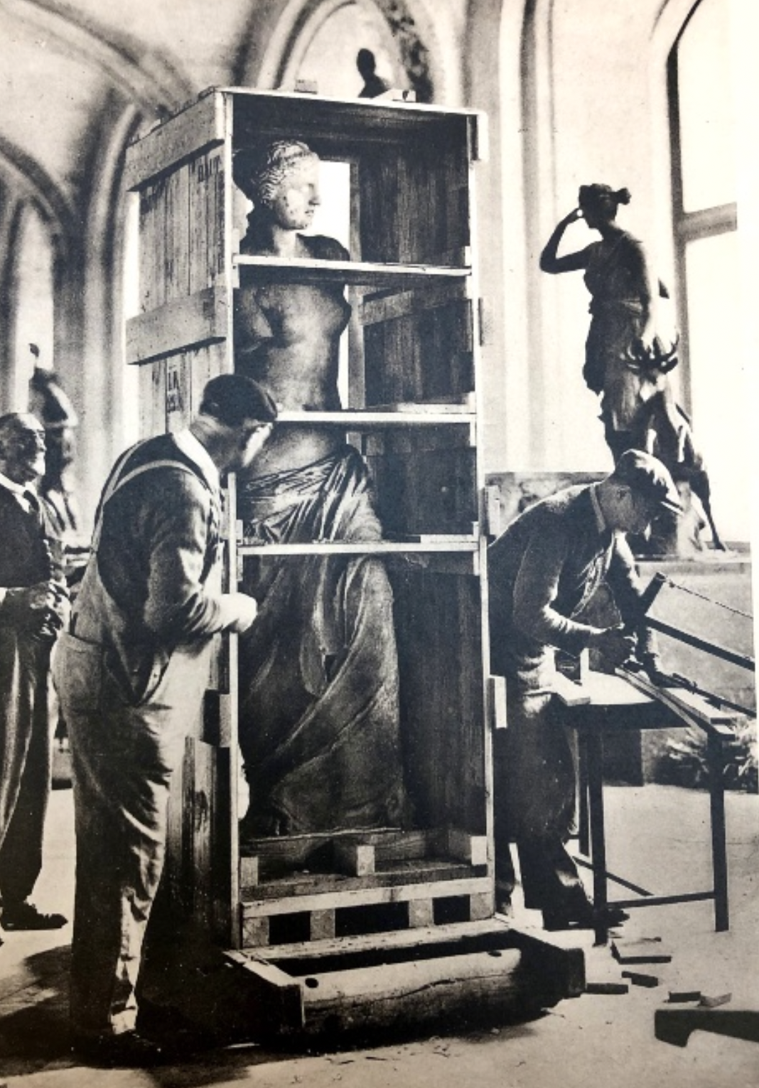 The evacuations of 1870 and 1914 paled in comparison to what the Louvre would go through in 1939. Once again, it was the last week of August when the Louvre would close, and hundreds of people from the École du Louvre, department stores, and the Louvre staff quickly removed the art from the walls and built crates for the statues. Beginning September 1, convoys left the Louvre day and night, but Venus and her friends, Winged Victory and the Dying Slaves, remained securely in the Louvre.