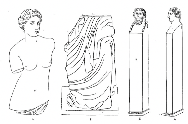 Dumont d’Urville described what he saw in great detail "The statue whose two separate parts I measured was about six feet high; it represented a naked woman, whose raised left hand held an apple, and the right supported a belt skillfully draped and falling carelessly from the kidneys to the feet: moreover, they were both mutilated, and are currently detached from the body. The hair is curled from behind and held by a headband. The figure is very beautiful and would be well preserved if the tip of the nose had not been damaged. The only foot that remains is bare: the ears were pierced and had to receive pendants[4]. "