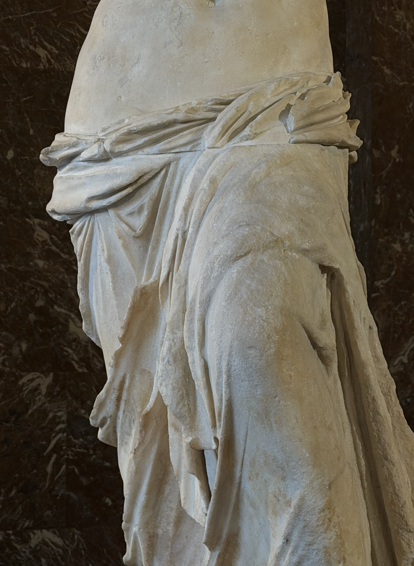 Held together in the center by metal rods of her upper body, which slide into two mortises of her lower body. Her body went through a lot between its discovery and transport to the various boats and arrival in Paris. Considering her age, she was in relatively good condition. Close up, you can really see the damage on her upper back and near her stomach of layers of stone that have disappeared.