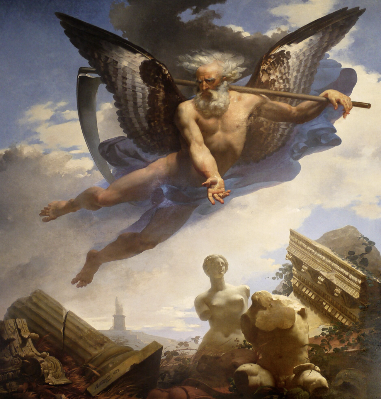On the first floor in the Salle des Verres, just past the Gallerie d’Apollon, look up at the painting by Jean-Baptiste Mauzaisse, Le Temps, showing the ruins he brings and the masterpieces he leaves to discover, 1822.